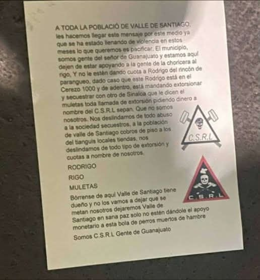 The municipality is ours, we are people of the señor of Guanajuato, and we are here so that you stop supporting the people of the “choricera” of Rigo. And do not be giving “cuota” to Rodrigo from Rincón de Parangueo, because this Rodrigo is in the Cerezo 1000 prison and from inside he is ordering extortion and kidnappings with another guy from Sinaloa, who is called “El Muletas” all focused on phone call extortion demanding money in the name of the C.S.R.L. They are not us. We disown all abuse towards the population of Valle de Santiago, the kidnappings, the cobro de piso and extortion of market vendors, we reject all forms of extortion and charges in our name.