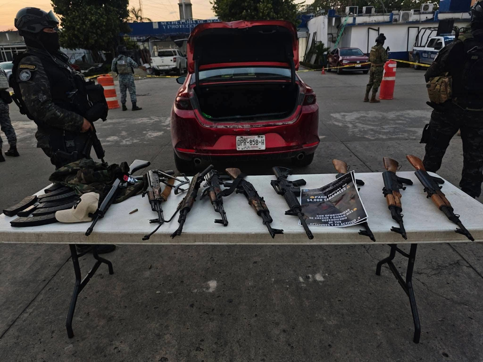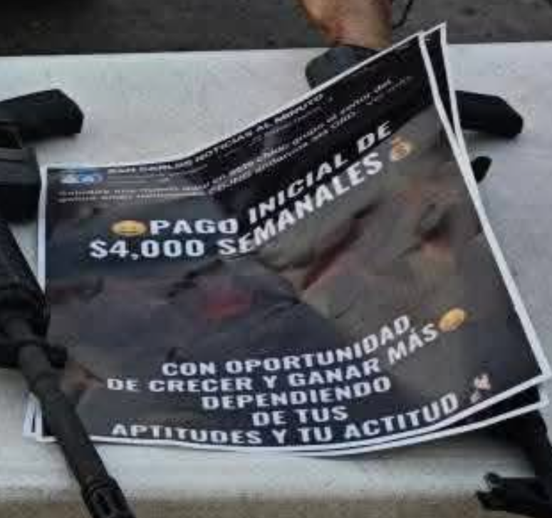 This particular recruitment poster advertises a job with pay more than double the typical weekly earnings in Tabasco state. The suspiciously high salary and vague job details would immediately signal to a reader that the offer comes from an organized crime group rather than a legitimate employer.