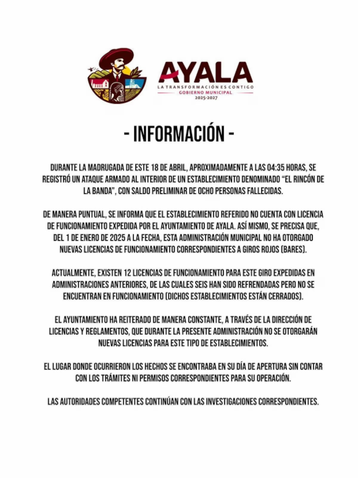 Around 4:30 a.m. on Saturday, a group of gunmen attacked the “Rincón de la Banda” bar in the municipality of Ayala in Morelos state, according to a local government press release. By the time authorities arrived at the scene, seven men and one woman were slain by gunfire.