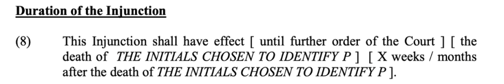 So the options are: (i) Until further order of the court (ii) Until the death of P; or (iii) Until a period of time after the death of P. It concerns me that a duration of “until further order of the court” seems to have become the default duration. In research I conducted for Cardiff University from October 2024 – December 2024, I found that of 32 Transparency Orders, 29 had a duration of “until further order of the court”. I understand that it is common for this to be the duration on the first order that is ever made, as applications are considered by the judge on the papers and people might want to argue about whether it is amended at a subsequent hearing. I can also understand the logic of deciding on an expiry date when it is clearer what is involved in the proceedings. But it’s not clear that it was ever the intention of the judiciary in setting up the Transparency Pilot and standard TO for “until further order of the court” to remain the duration of the TO once the proceedings are ended. It means the court is issuing orders restricting what people can say indefinitely. This is certainly not in line with case law today (Poole J, Re Gardner). I urge paralegals drafting TOs, lawyers checking them and judges approving them to actively consider the duration in future, as proceedings are coming to an end, rather than routinely leaving them as “until further order of the court”. Following Poole J (re Gardner), “until the death of P” should surely become the norm once there has been a final hearing. Since many older TOs are routinely recycled across successive hearings in the same case, legal teams will need to pay attention to updating them.