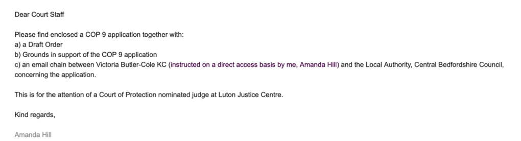 This consisted of a COP 9 form, which I completed myself, a copy of the draft order I was asking the court to approve (which was the same as the consent order sent to the Local Authority), the grounds for my application (essentially the same as the content of the email sent to the Local Authority but drafted in a different format and with some background information) and a copy of Victoria Butler-Cole’s email to the Local Authority and the reply (as proof that they were not opposing the application).