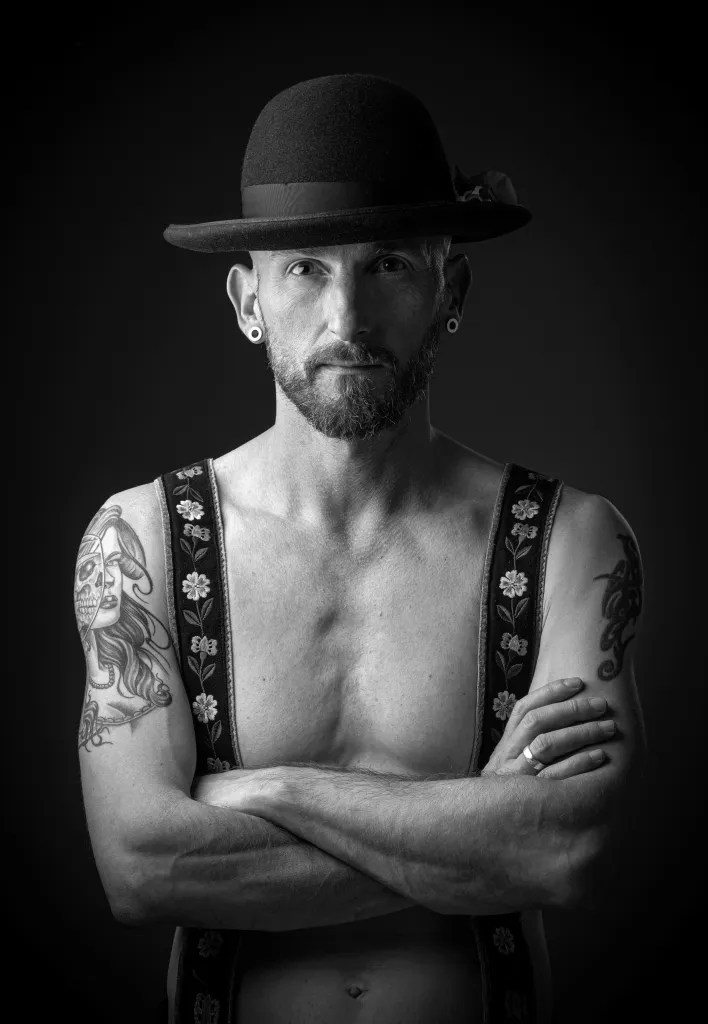 The shoot was an experiment, Ludwig says. “We had several different setups—without a hat, with a hat, with a shirt. And then the photographer asked, ‘Are you tattooed?’ And I said, ‘Yes.’” And so the heir to the long, long legacy of the Grüner Baum stands bare on the dining room wall.