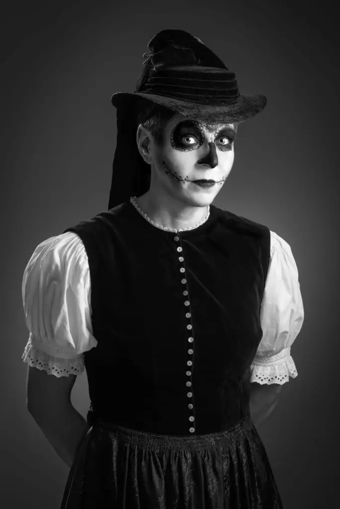 The couple in the portraits wear traditional folk costumes, down to the woman’s puffed white sleeves and the daisies embroidered on the straps of the man’s suspenders. They resemble the subjects of the folk portraits that hang all over the Black Forest, with some exceptions: At the Grüner Baum, the woman wears a skull painted over her face, and the man is shirtless, tattooed shoulders exposed.