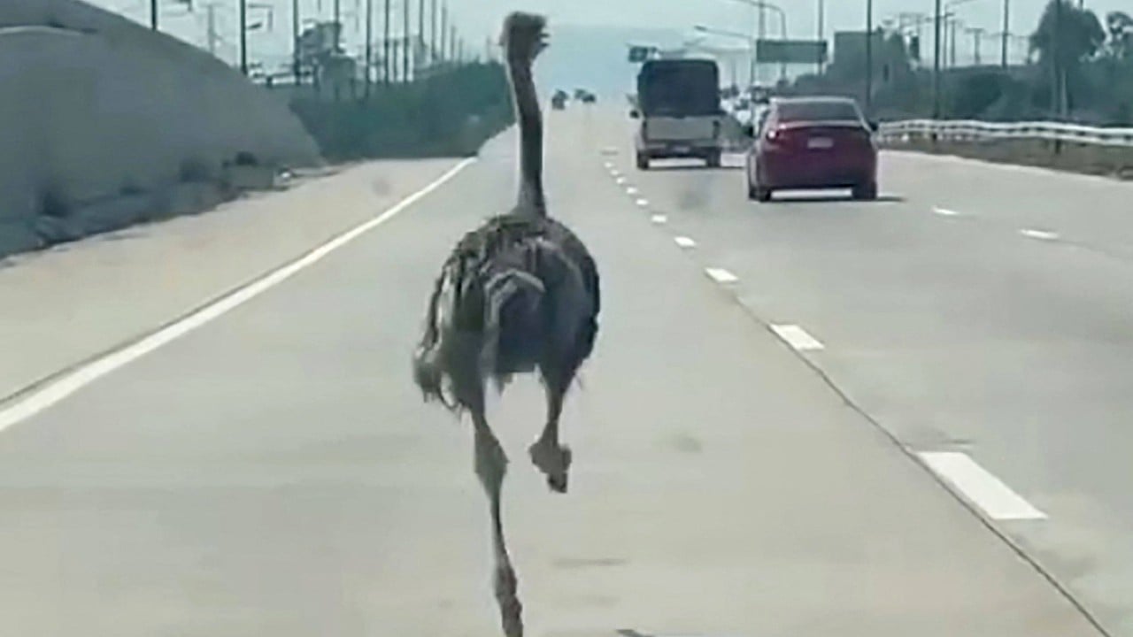 The six-month-old male ostrich raced along a three-lane highway in Thailand’s coastal Chonburi province as cars and trucks sped by the flightless bird, according to a video posted by a man who was driving directly behind it.