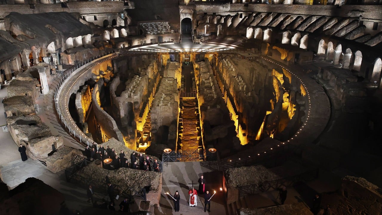 Inside the Colosseum, Leo began the procession flanked by two young people holding torches, and followed by clergy.