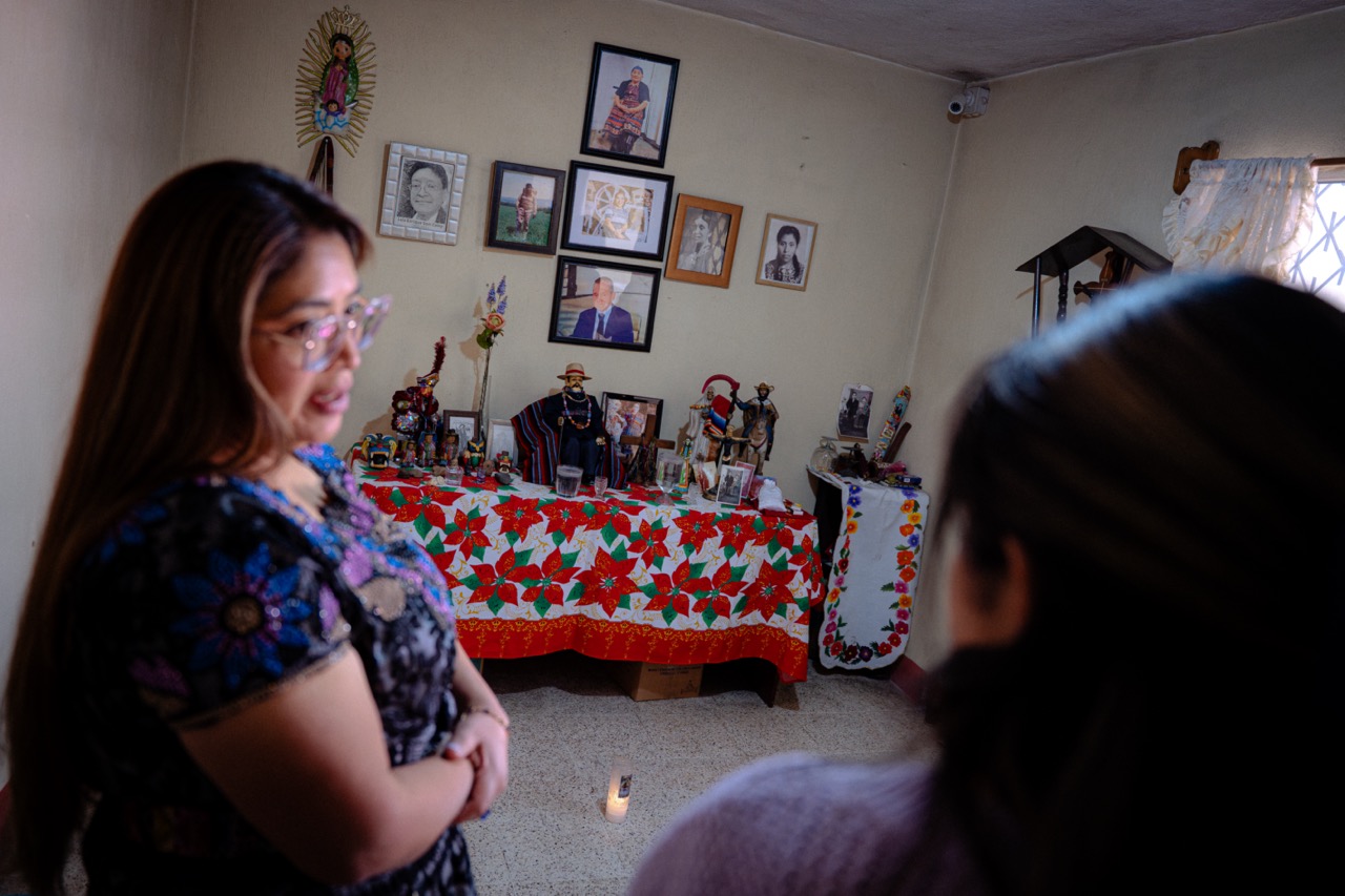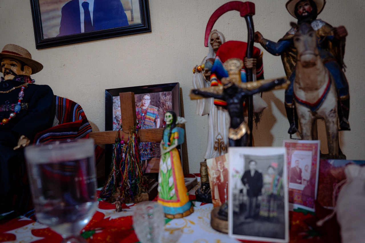 In the mountain town of Quetzaltenango, Guatemala, on the second floor of Ada Violeta Chuc’s home, a room with faded cream-colored walls holds an altar to honor her family’s ancestors. A wooden cross stands in the center of a table covered by a tablecloth printed with red poinsettias. A dozen figurines of Indigenous and Christian deities, along with candles, water, incense and other offerings surround the cross.