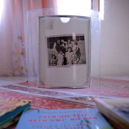 On the wall behind the table hang photos of seven deceased relatives. Four died of cancer.