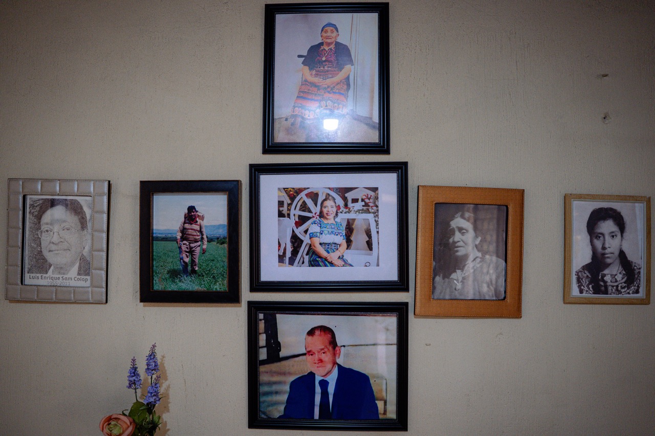 The photo in the center of the gallery is the most recent addition: Chuc’s mother, Francisca Violeta Sam Colop, who died in July 2025 after a long journey with skin cancer. In the photo, Sam Colop, an Indigenous Maya K’iche’ educator from the Guatemalan highlands, is smiling widely, sitting with crossed arms, wearing a traditional handwoven blouse, or huipil, with blue, green and purple embroidery.