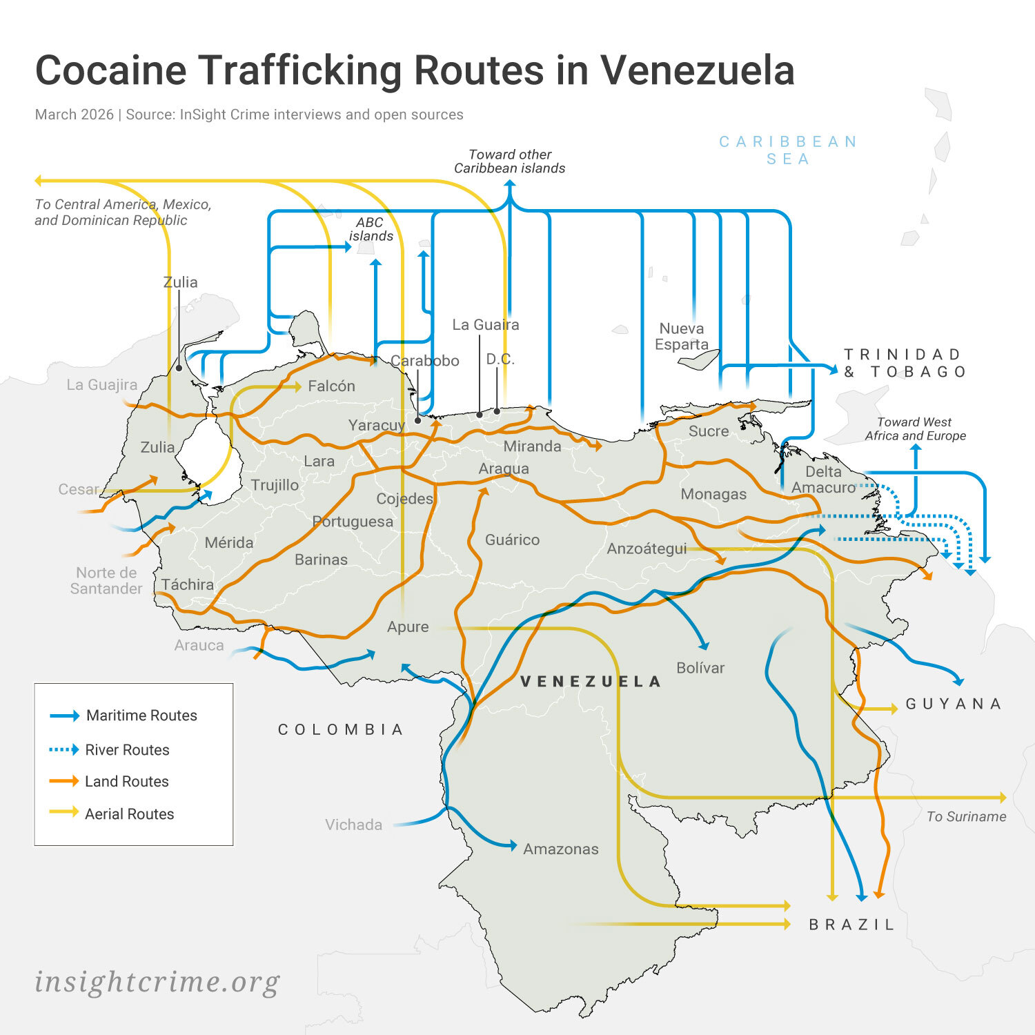 The cocaine supply chain starts in South American production zones, principally in Colombia. Some of this product is dispatched directly from Colombia to Central America and Mexico, from where it continues northwards toward the United States. But much of it is moved via Venezuela, taking advantage of its long, porous border with Colombia and extensive coastline. Once inside Venezuela, some shipments are transported east to Guyana and Suriname or South into Brazil. Most, though, are shifted toward coastal departure points using a mix of river, road, and air transport. From these transshipment hubs, loads begin their next leg toward islands in the Caribbean.