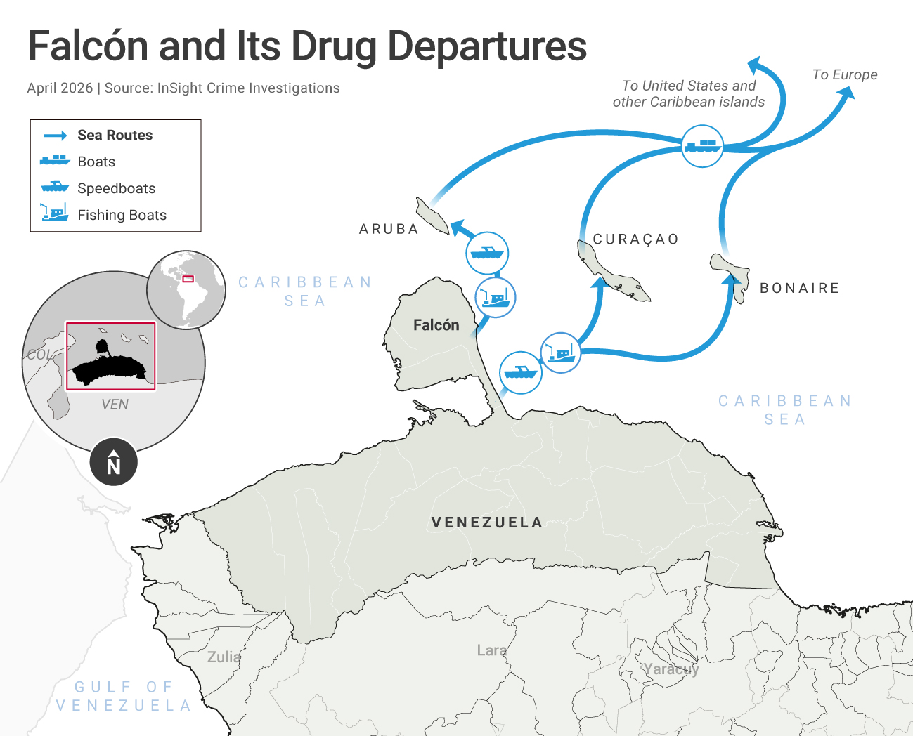 The ABC islands—Aruba, Bonaire, and Curaçao—sit just off Venezuela’s coast, making them a key stopover for cocaine shipments dispatched from the state of Falcón. From the islands, traffickers move smaller loads north through the Caribbean in small vessels—such as go-fast and fishing boats—or across the Atlantic to Europe aboard container ships and private yachts.