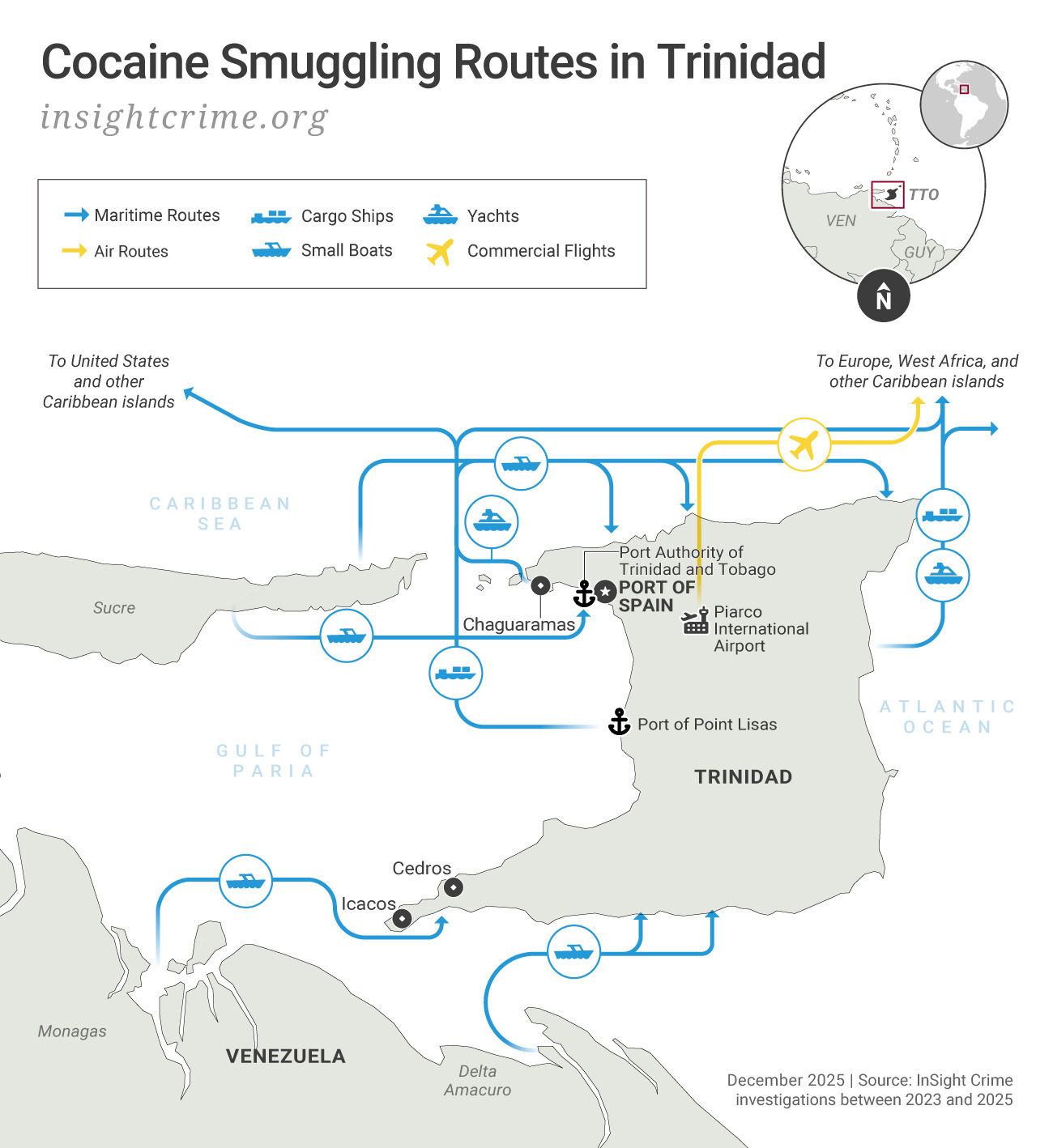 Further east, Trinidad and Tobago lies just a few miles off the coast of Venezuela. Traffickers use small boats to shuttle drugs to the islands from the states of Sucre and Delta Amacuro. There, local networks transfer loads to storage facilities. Shipments are then moved north towards the United States, hopping between other Caribbean islands, or are shipped directly to Europe aboard cargo ships and yachts.
