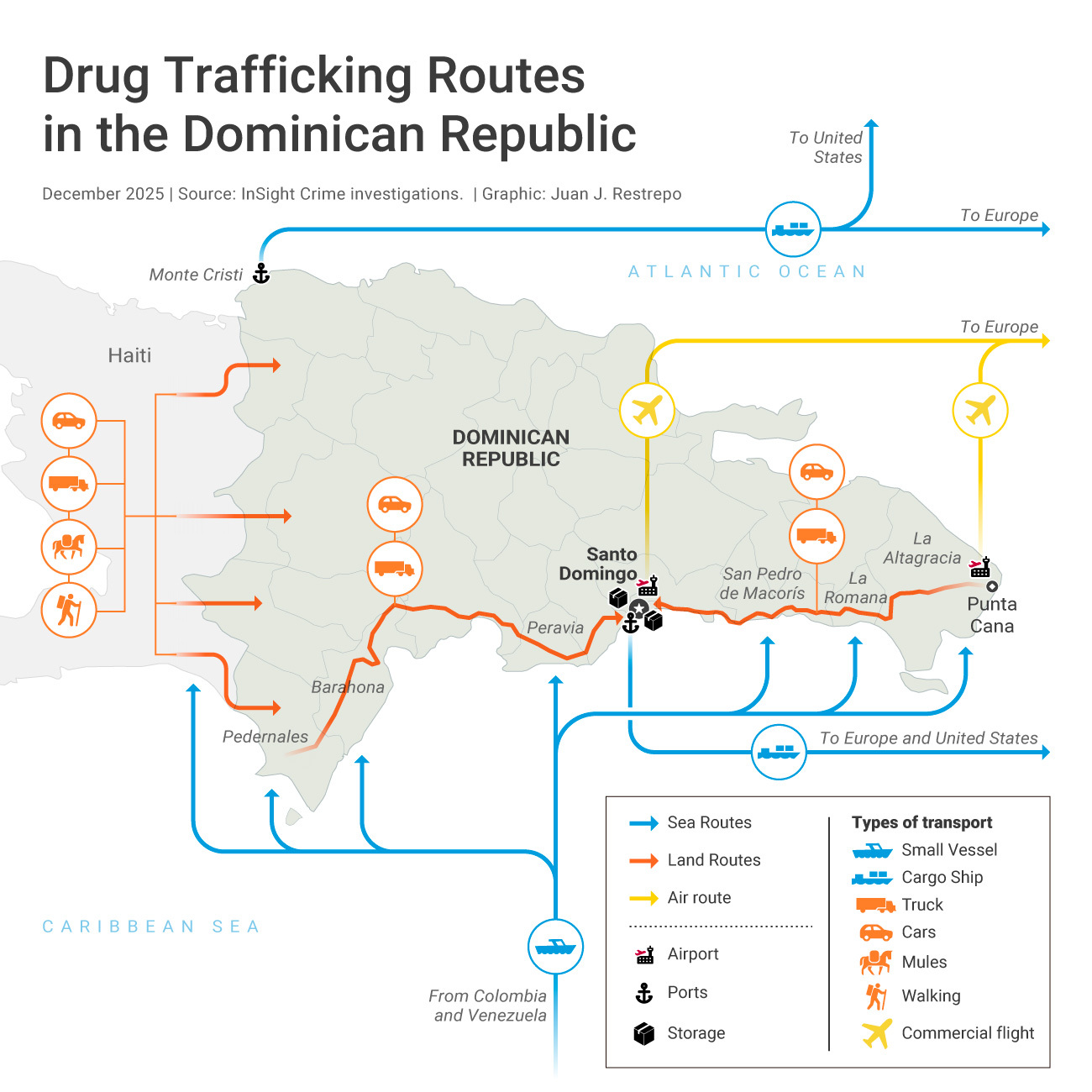 Traffickers often route cocaine via the southern coast of the Dominican Republic, where they offload shipments from boats or small vessels. The long, lightly policed coastline and proximity to South America make it an ideal staging area. Criminal groups also exploit the porous border with neighboring Haiti to smuggle cocaine into the Dominican Republic along roads and footpaths. Once inside the country, drugs are moved inland to major ports like Santo Domingo and Caucedo, where they can be concealed in shipping containers before crossing the Atlantic to Europe or heading to North America.