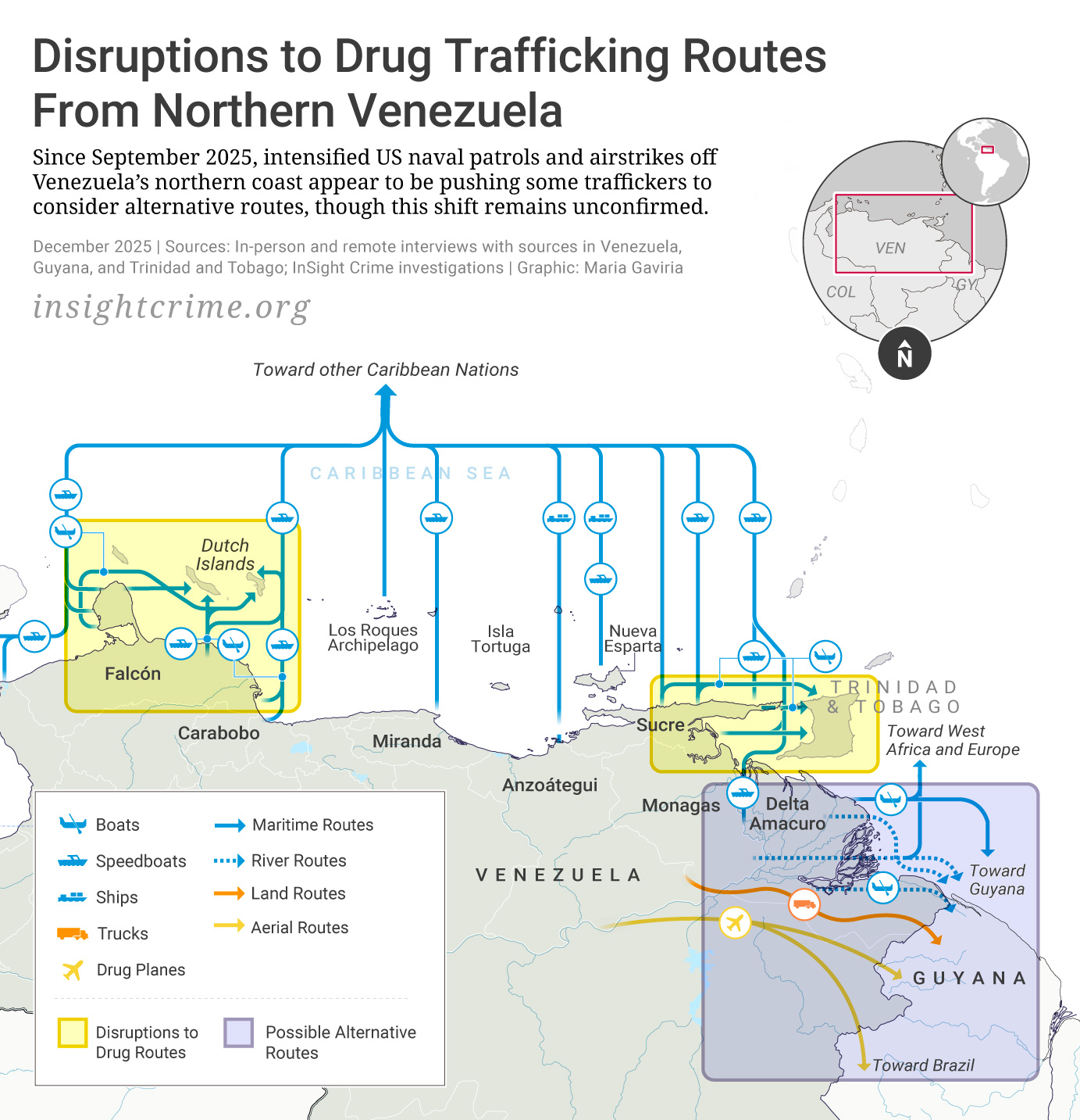 In September 2025, the United States targeted go-fast boats and small vessels with lethal airstrikes and deployed a flotilla of military assets in the southern Caribbean. These operations disrupted maritime channels between Venezuela and the ABC islands, as well as routes to Trinidad and Tobago. Some traffickers paused operations or left heavily patrolled areas. But the campaign only disrupted some of the Caribbean trafficking corridors while leaving others open. There is also evidence to suggest criminal networks shifted routes east toward Guyana, Suriname, and Brazil to avoid the US military.